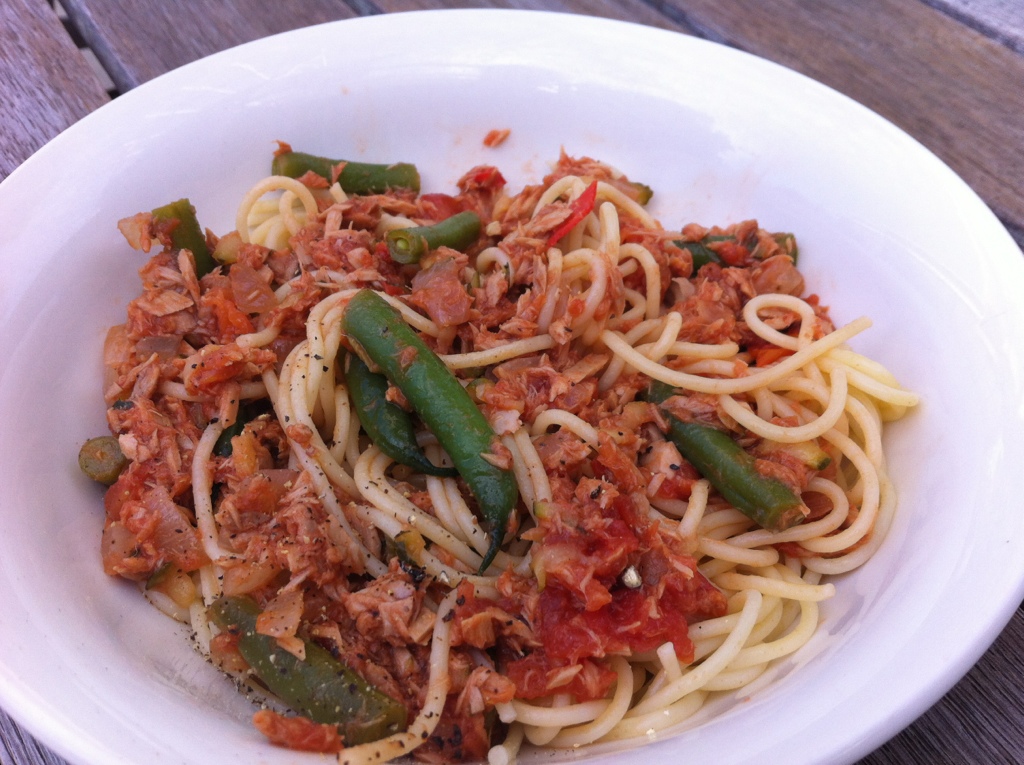 My blog post was now complete, so I was able to give my full attention to dinner. The glass was cleared off the floor, the offending dish was left to cool in the oven and I left Joanna to analyse what had caused the explosion. Okay, what now, where’s my I-phone? The spaghetti was already cooked, and a quick sauce was required. With a few ingredients from the pantry and fridge something could be created.