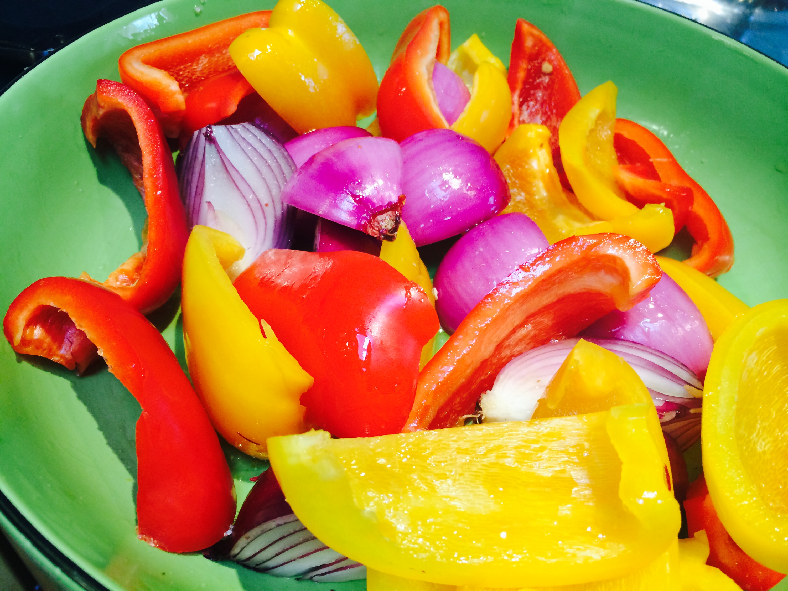 Spread peppers, and onions in single layer in oven tray and cook for 15 – 20 minutes, until peppers start to shrivel and darken. The courgettes can be added later, as they only need 10 minutes to cook.