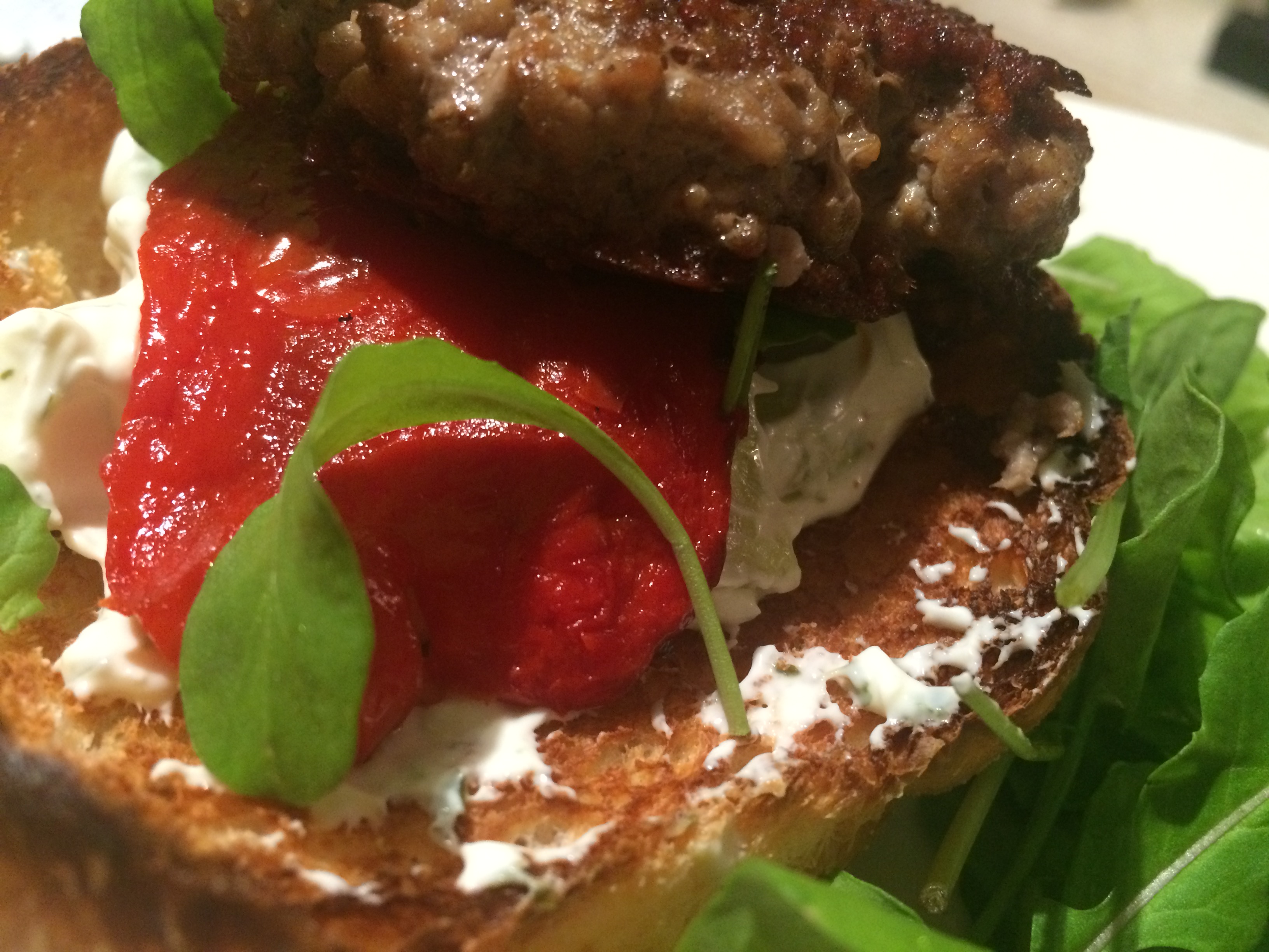 I served my burgers with cucumber raita, chargrilled red peppers and rocket.