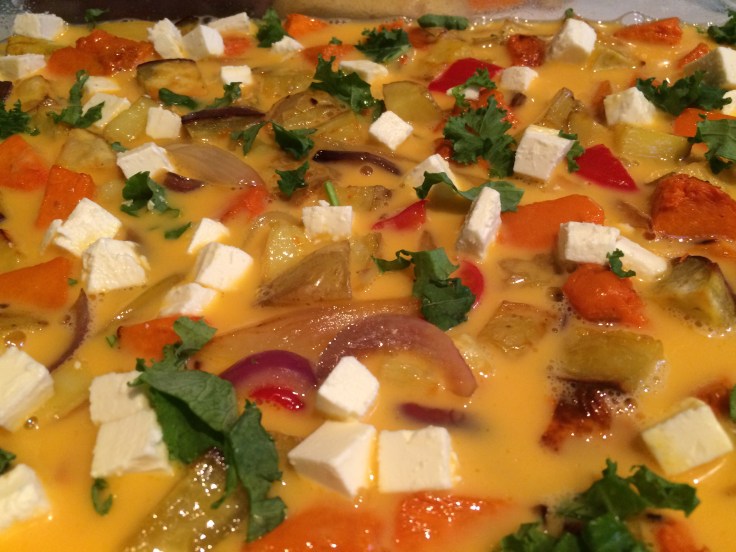 • Place roasted veges, onions in bottom of a suitable oven dish.  I used a 22.5cm x 33cm pyrex dish, which makes the frittata more like a slice