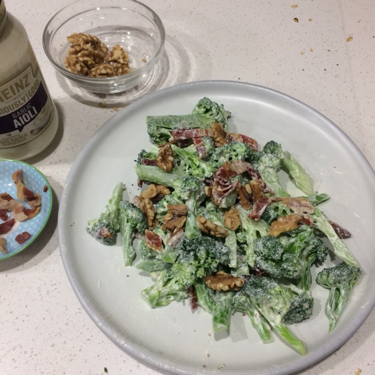 Broccoli is my go-to green vegetable, and it takes s0 little time to cook. The stalks, can be peeled, grated and added to coleslaw, or if you are like me, eat while prepping the evening meal. This vegetable is so versatile, full of vitamin c, and can be eaten hot or cold. This salad makes broccoli taste yum. Make this at the weekend to accompany your lunch during the week or take as a side dish to a lunch, or bbq. Try it, and you may just like it!